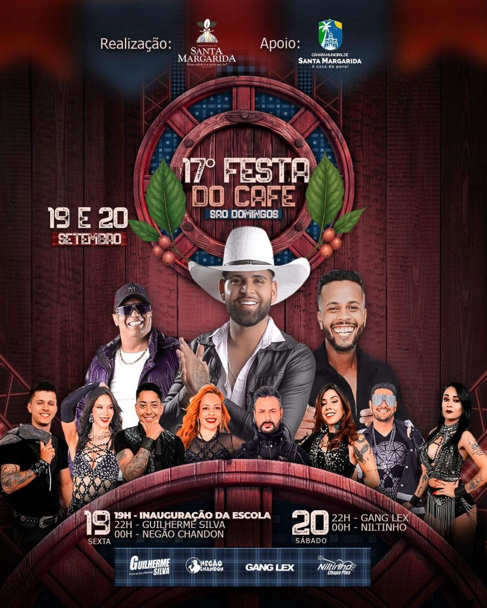 SANTA MARGARIDA (MG) - A 17ª Festa do Café será realizada nos dias 19 e 20 de setembro, com programação que inclui inauguração de obra e shows musicais. O evento é um dos mais tradicionais da comunidade e promete atrair moradores e visitantes da região.