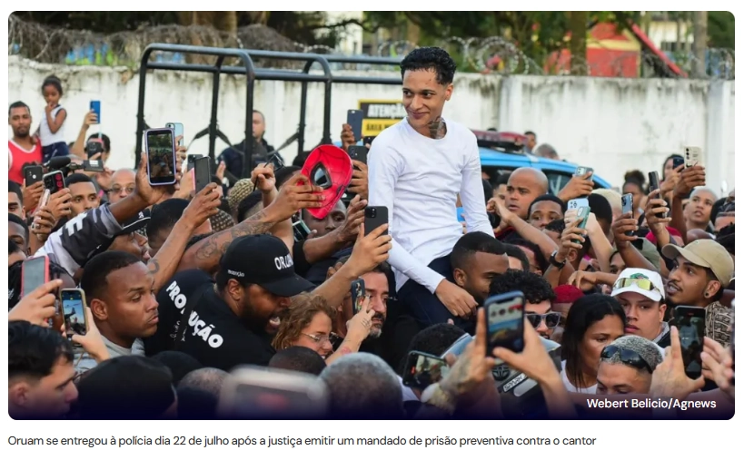 Oruam se entregou à polícia dia 22 de julho após a justiça emitir um mandado de prisão preventiva contra o cantor, que foi indiciado por sete crimes (tráfico de drogas, associação ao tráfico, resistência, desacato, dano, ameaça e lesão corporal).