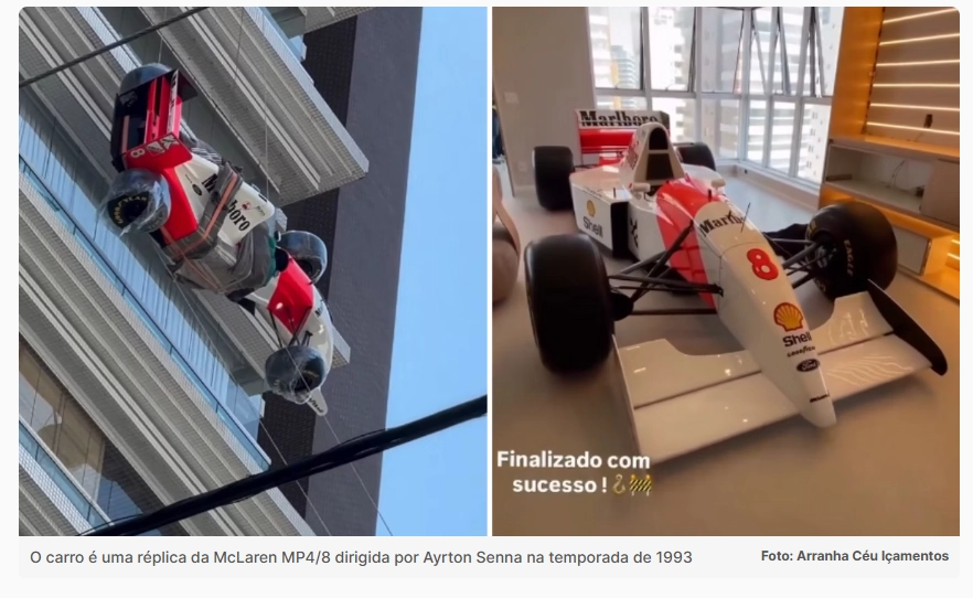 Uma empresa chamou atenção ao transportou uma réplica do carro "McLaren" de Ayrton Senna para um apartamento no 13º andar de um edifício no Tatuapé, na Zona Leste de São Paulo. A operação ocorreu na terça-feira (30) e ganhou repercussão nas redes sociais após a divulgação de um vídeo mostrando o veículo suspenso no ar.