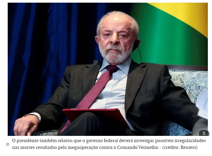 Essa foi a primeira vez que o presidente brasileiro comentou a megaoperação realizada pela Polícia Civil e Militar do Rio de Janeiro, que deixou ao menos 121 mortos e 112 presos. Antes do pronunciamento de Lula, ministros do Palácio do Planalto já haviam criticado a ação policial.
