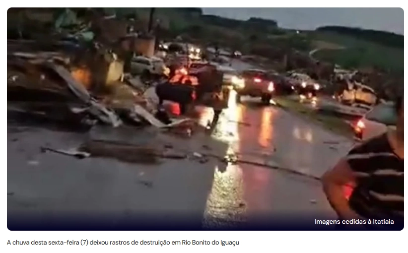 O Governo do Paraná afirmou que acompanha a situação das cidades atingidas pela chuva nesta sexta-feira (7). Imagens recebidas pela Itatiaia mostram um cenário de destruição no município de Rio Bonito do Iguaçu, a cerca de 400 km da capital, Curitiba.
