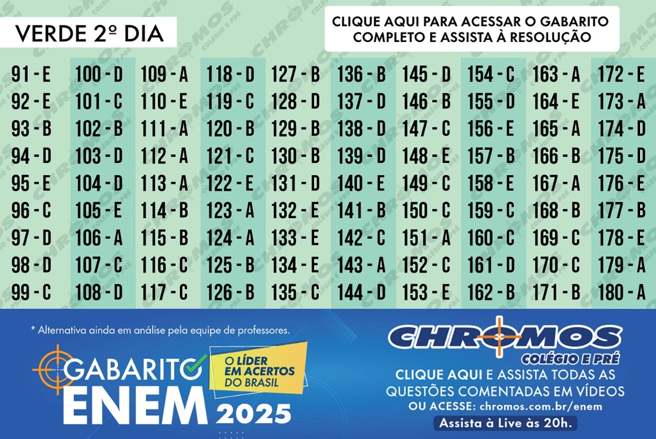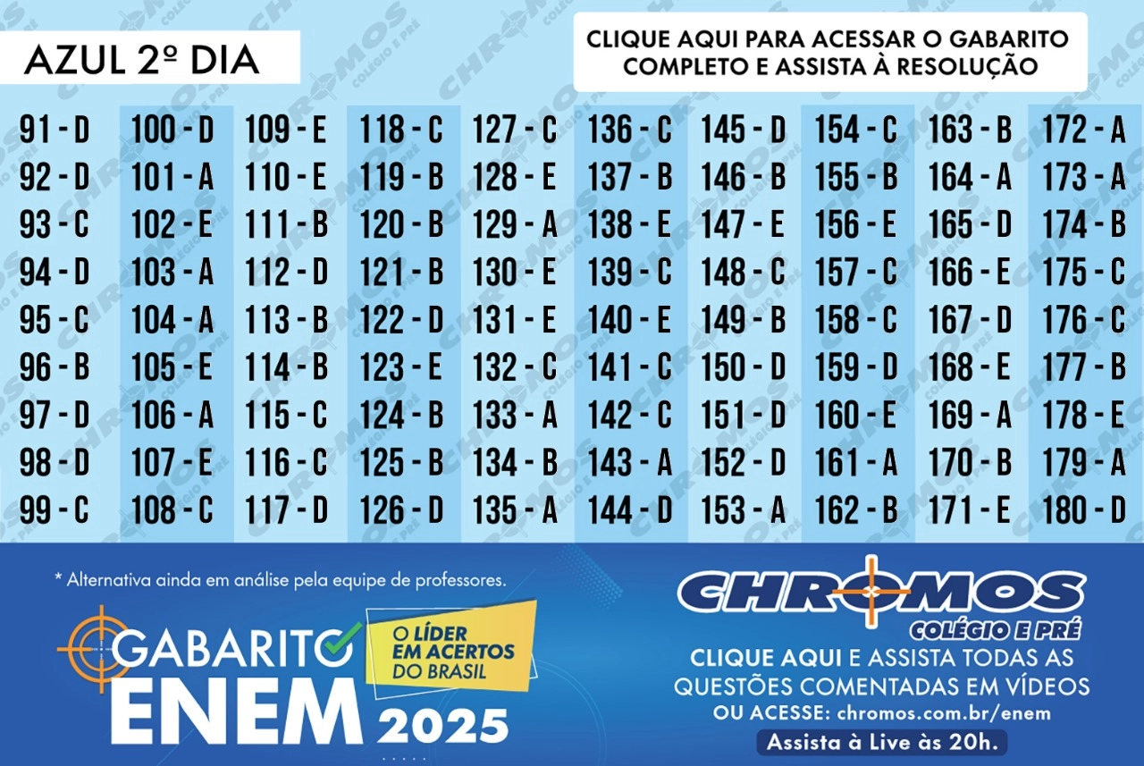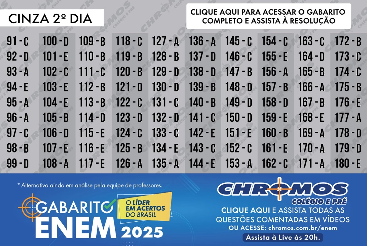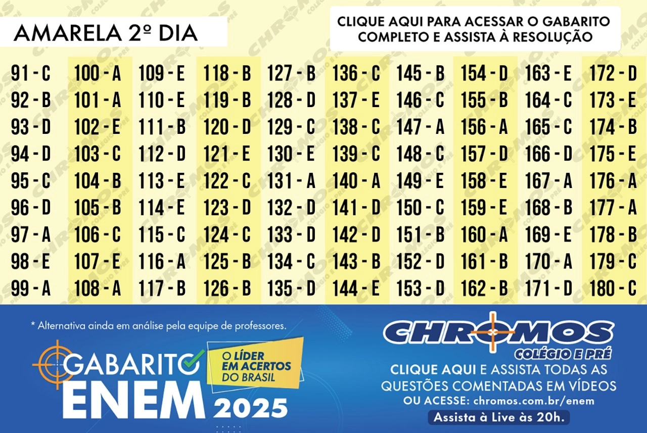 Enquanto a nota final não chega, os especialistas da Rede Chromos de Ensino resolveram as questões e montaram um gabarito extraoficial das provas deste domingo. Veja as respostas de acordo com a cor do caderno.