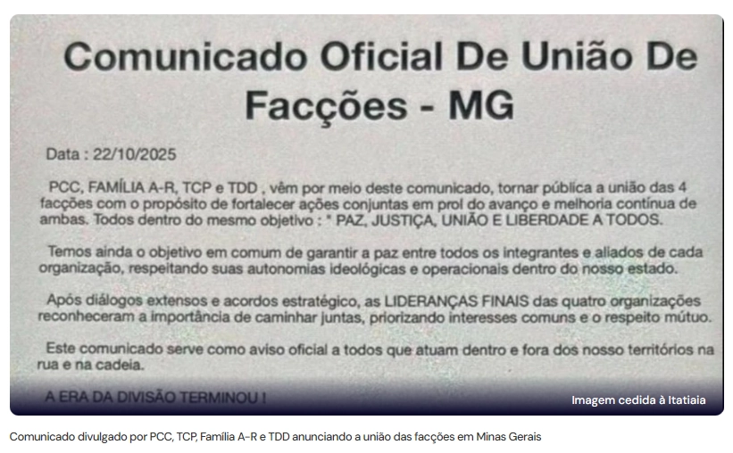 Duas das maiores facções brasileiras se juntaram com duas organizações criminosas mineiras; um comunicado foi publicado pelos grupos em outubro