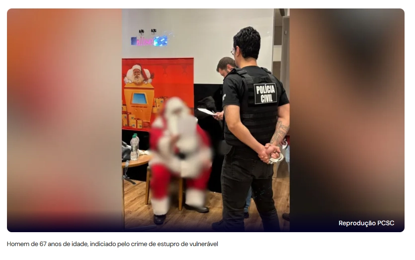 Um homem de 67 anos que estava exercendo a função de Papai Noel em um shopping da cidade de Lages, em Santa Catarina, foi preso por estupro de vulnerável. Segundo a Polícia Civil, os crimes não ocorreram no estabelecimento, mas detalhes das denúncias não foram divulgados.