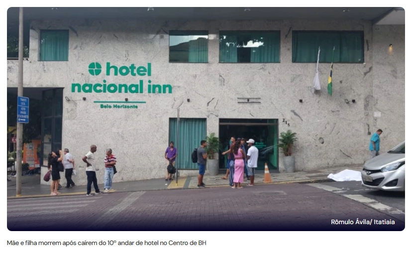 Uma mulher de 32 anos e a filha dela, de 6, morreram após uma queda do 10° andar do Hotel Nacional INN, localizado entre as ruas Espírito Santo e dos Caetés, no Centro de Belo Horizonte. O caso ocorreu na tarde desta segunda-feira (1°). A Polícia Civil de Minas Gerais (PCMG) investiga as mortes.