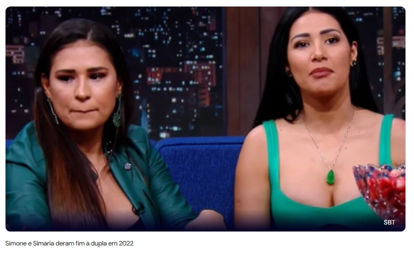 A dupla sertaneja Simone e Simaria chegou ao fim em agosto de 2022. Atualmente, as irmãs seguem caminhos diferentes: Simone Mendes continua em uma carreira solo na música, enquanto Simaria está afastada dos palcos, dedicando-se à maternidade.