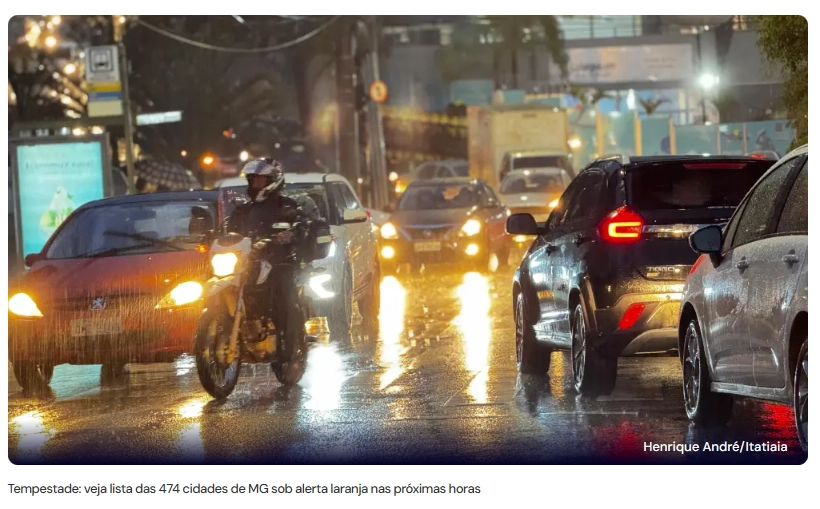 O Instituto Nacional de Meteorologia (Inmet) emitiu um alerta laranja de tempestade, de grau de severidade perigo, para 472 cidades de Minas Gerais, incluindo a capital Belo Horizonte. O aviso é válido até às 10h desta quarta-feira (3).