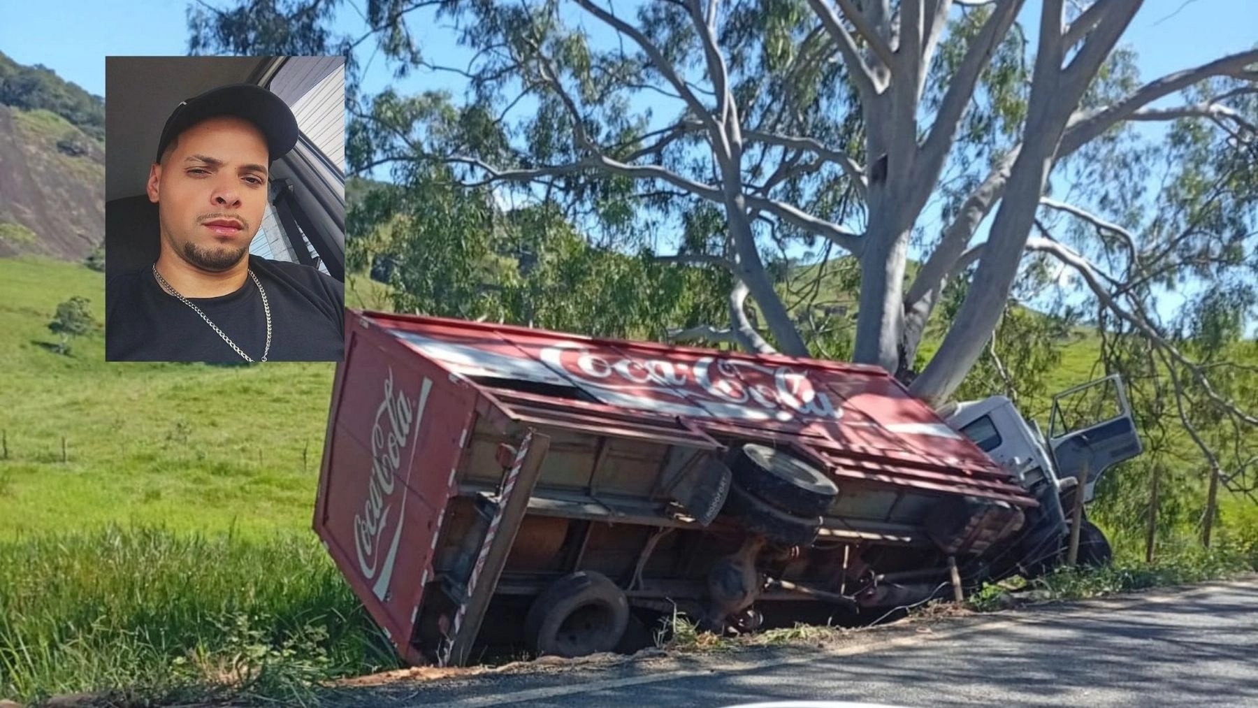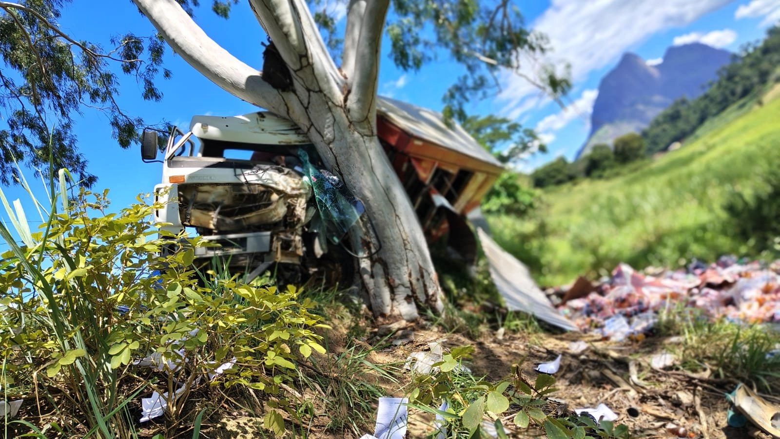 Para evitar a colisão traseira, o motorista tentou reduzir a velocidade, mas não conseguiu engatar a marcha. Com isso, perdeu o controle da direção, invadiu a contramão e saiu da pista, colidindo contra uma árvore de eucalipto. Parte da carga de bebidas foi derramada com o impacto.