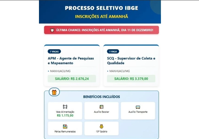 IBGE abre processo seletivo com oito vagas para Manhuaçu