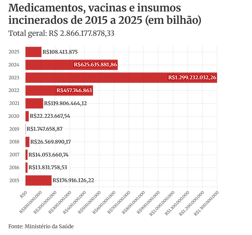 Somente em 2025, foram incinerados 108,4 milhões de reais em produtos, sendo 18,5 milhões ainda dentro do prazo de validade. Entre os itens descartados estão medicamentos de alto custo contra o câncer, tratamentos para doenças raras e vacinas.
